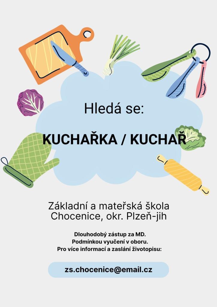 Základní a mateřská škola v Chocenicích, okres Plzeň-jih, vyhlašuje výběrové řízení na pozici dlouhodobý zástup na místě kuchaře za mateřskou dovolenou. Podmínkou je vyučení v oboru.